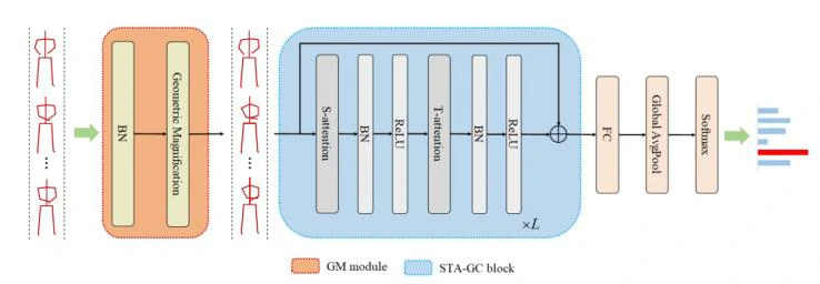 设计了几何放大模块(GM模块):为了应对MG幅度较小的特点,作者设计了GM模块,根据运动方向自适应地放大输入关节坐标的运动幅度,以提高MG识别的准确性。