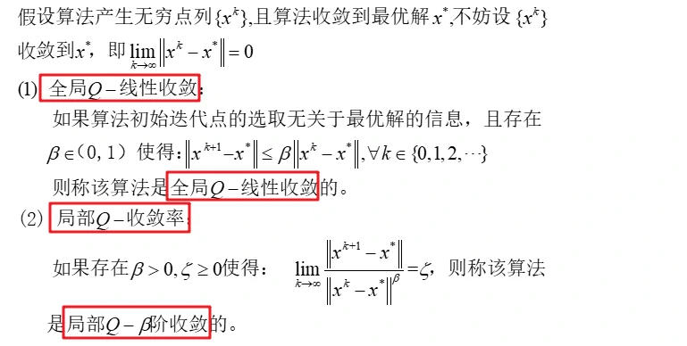 收敛:如果算法是有限终止的,或所产生的迭代点列的每个聚点是优化问题的最优解,则称该算法是收敛的。