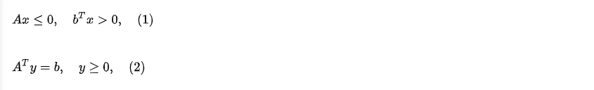- 若b落在锥外:那么因为b点和A的行锥均为凸集,所以恰可利用凸集分离定理直接得到方程(1)