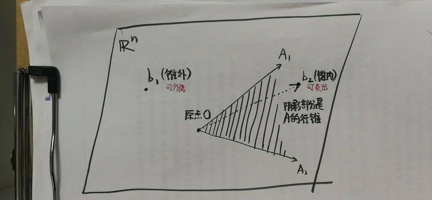 - 请见顶图,在空间Rn中,用矩阵A的行张成一个锥(张成锥与张成线性空间的区别就在于前者只能用非负的组合系数),即图中的锥OA1A2(阴影部分)