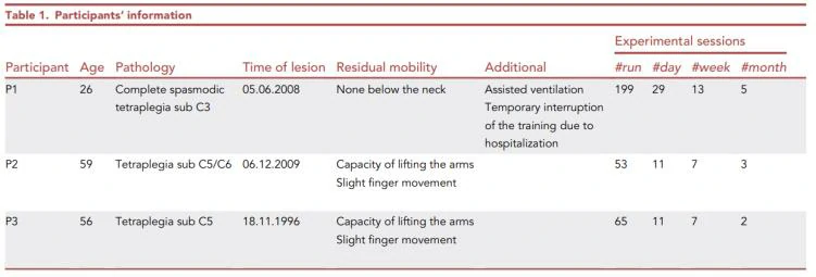 三名参与者均为男性,且为脊髓损伤(SCI)后四肢瘫痪者和轮椅使用者(P1-P3,见表1)。P1 26岁,其颈部以下无活动能力,依赖辅助通气。P2 59岁,其剩余运动功能仅限于举起手臂和手指的轻微运动。P3 56岁,他可以轻微移动手臂和手指。