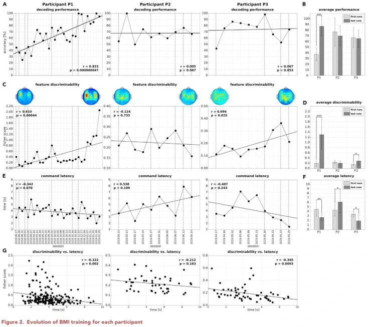 在第一次训练中,当设备的反应与用户的想法一致时,三名受试者的准确率在43%至55%区间内。在训练过程中,该团队发现受试者1的准确性有了显著提高,在训练结束时达到了95%以上的准确性。该团队还观察到,在用新算法更新设备之前,受试者在训练中途的准确率提高了3%至98%不等。