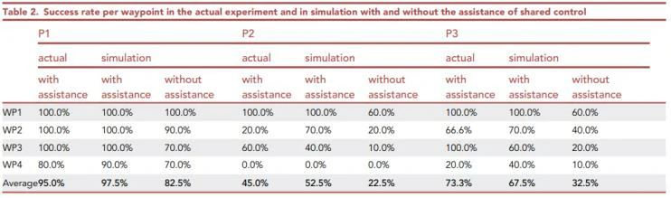 为了确定共享控制对导航性能的关键贡献,该研究用一个概率输入接口来模拟导航结果,该接口专门针对每个参与者的控制特性–即BMI精度和命令延迟。表2描述了在有或没有共享控制辅助的情况下,每个参与者在模拟中到达航路点的百分比。在共享控制下的仿真结果与各参与者的实际结果一致。对于BMI准确度高和命令延迟低(P1、P3)的受试者,共享控制仍然支持导航,但仅支持46.7±13.6%和42.3±18.4%的时间百分比。 对于较差的P2,共享控制在83.3±4.8%的运行时间内,在没有用户命令的情况下帮助驾驶轮椅。
