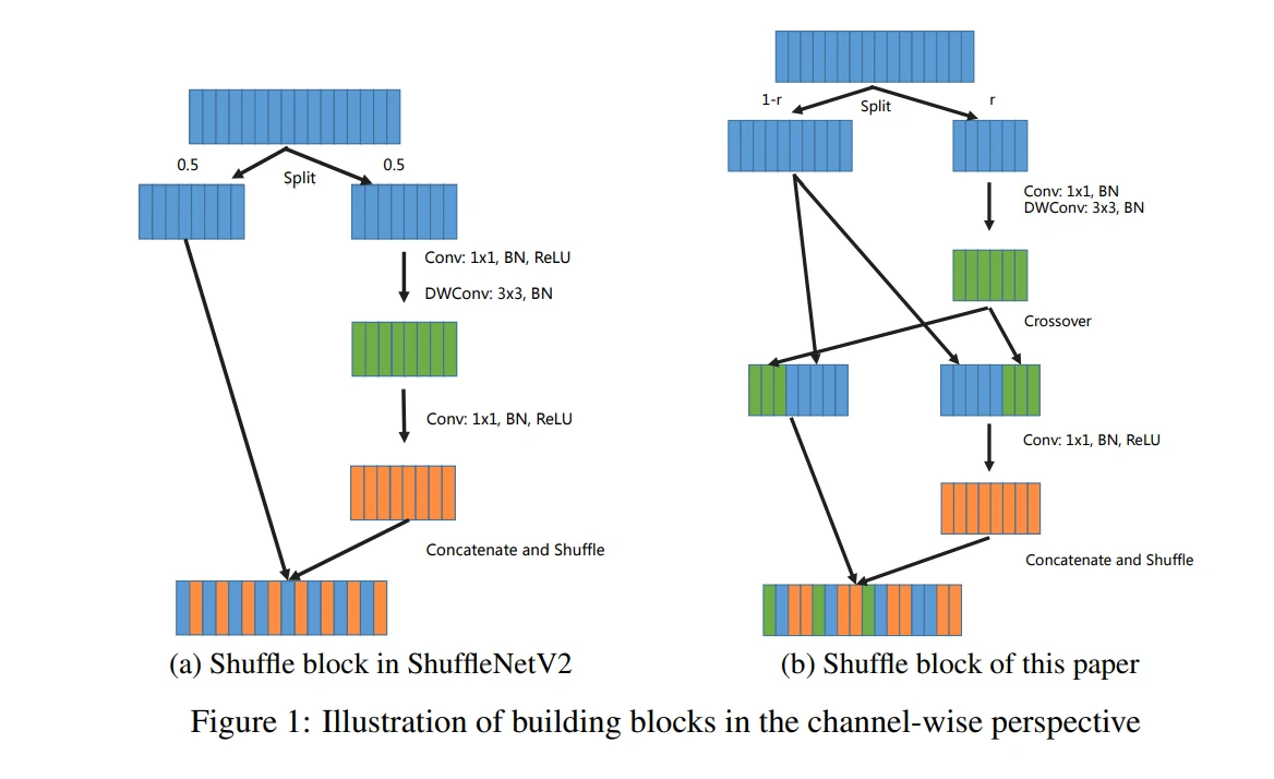 - 在depth-wise convolution之后引入channel crossover, 将输出特征和模块输入保留的特征通道交叉互换一半。这样一来,第三层 1×1 convolution的输入通道其实正好等于整个模块输入通道数量的一半。因此,改良的模块就不需要修改架构参数来构建模型,从而和原始ShuffleNetV2模型进行公平的比较。