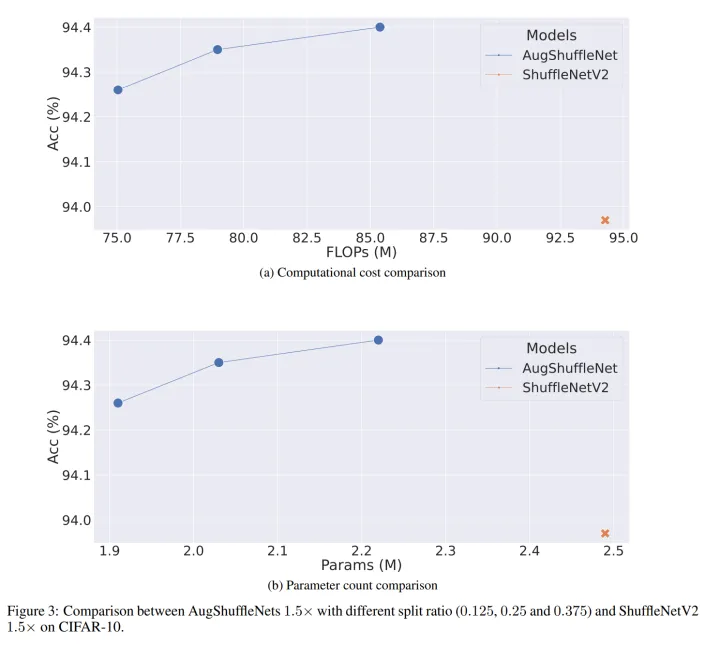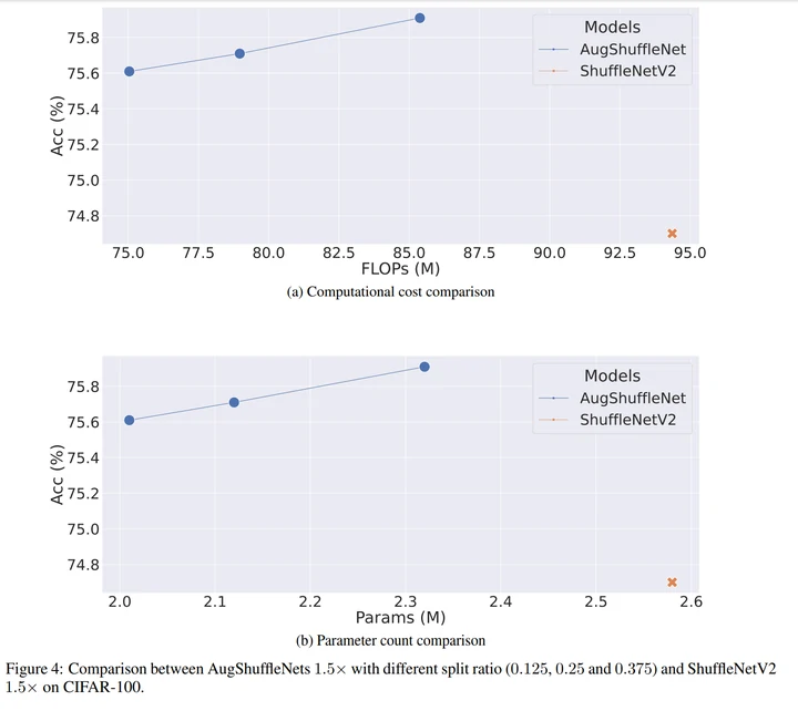 即使在分割率最小为0.125(蓝线最左边那个数据点)的情况下,AugShuffleNet 1.5x cifar10和cifar100上准确率仍能领先ShuffleNetV2 1.5x 0.29%和0.91%。cifar10上,前者的计算量和参数量仅为后者的79.6%和76.7%;cifar100上,前者的计算量和参数量则是后者的79.6%和77.9%。
