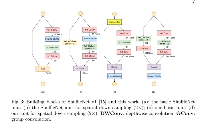 - Short Paths:利用 Partial computation的结构特点,使用 channel split 和 channel shuffle 操作相互配合,使得浅层的特征能够有周期规律地混入网络的更深层(ShuffleNetV2原文提到这是特征重用,类似DenseNet. 我更倾向于叫它特征延迟使用,因为它实际上并没有真正地重复使用浅层特征)。与UNET、ResNet和DenseNet等模型类似,这可以保证模型能够不依赖残差连接,也能为网络引入优化过程中的短路径(short paths),降低优化难度,并提升模型性性能。顺便一提,残差的输入是2个张量,输出是一个张量,条件相同情况下其访存成本比卷积层还高,残差连接数量过多会影响模型推理延时。