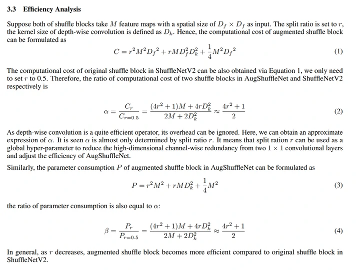 图5分析了改良模块相对于原始 Shuffle Block 的效率(计算量和参数量)。总而言之,channel split 的通道分割率 r,决定了效率, r 越小,其效率就比原始 Shuffle Block 更高。