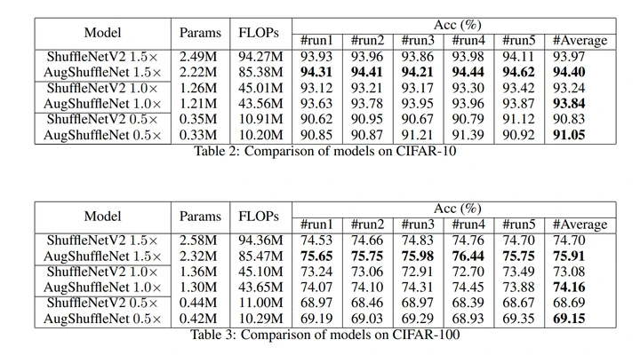 实验表明,Cifar10和Cifar100上,AugShuffleNet模型性能和效率都优于ShuffleNetV2。