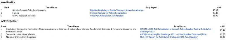 2021 年 AVA 挑战赛是 CVPR 2021活动识别国际挑战赛 (ActivityNet)研讨会的一部分。与前一年一样,该挑战赛有两个独立的任务:用于原子动作检测的AVA-Kinetics和用于说话人检测的Active Speaker 。今年的 Active Speaker 获胜者将之前的最佳分数提高了 5.6% 的绝对 mAP,几乎减少了 50% 的相对误差,而 AVA-Kinetics 获胜者在已经很强大的基线上提高了 1.05% 的绝对 mAP。