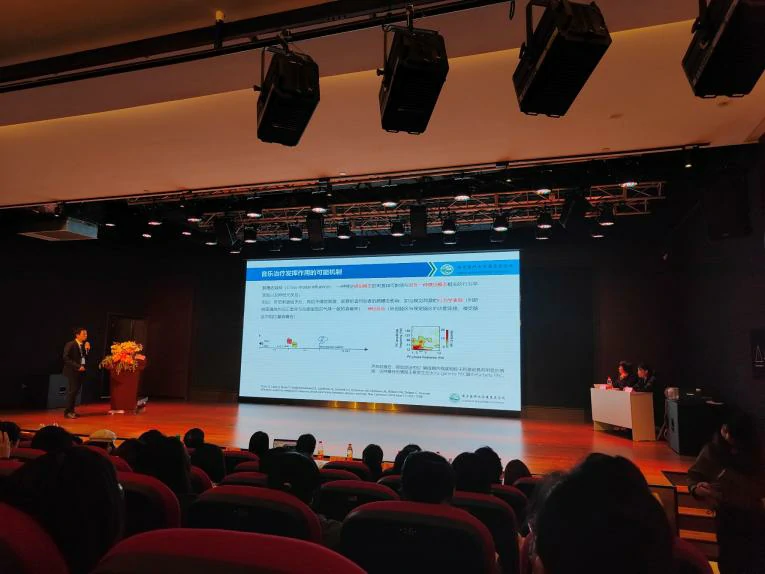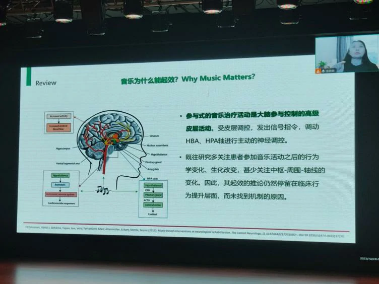 接着,首都医科大学康复医学院、中国康复研究中心心理科副主任张晓颖带来了音乐治疗在临床医学中的进展和应用分享,张医生重点介绍了音乐治疗的定义以及音乐能起效的生理机制方面的探索。