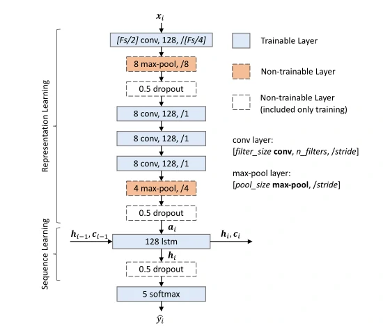 网络的第二部分是单向的循环神经网络RNNs,由单个LSTM层和一个丢弃层组成。这一部分用于学习输入信号的时间信息,因为考虑到睡眠专家会根据前面的阶段确定下一个可能的睡眠阶段的睡眠转换规则,比如说如果当前的睡眠阶段是N1,那么下一个阶段可能就是N1或者N2。与之前的工作DeepSleepNet模型不同,作者使用单向LSTMs,而不是双向LSTMs,以去除对脑电图进行反向处理的需求。这将序列学习所需的计算资源减少了大约一半,因为模型只需要向前考虑各个睡眠时期。