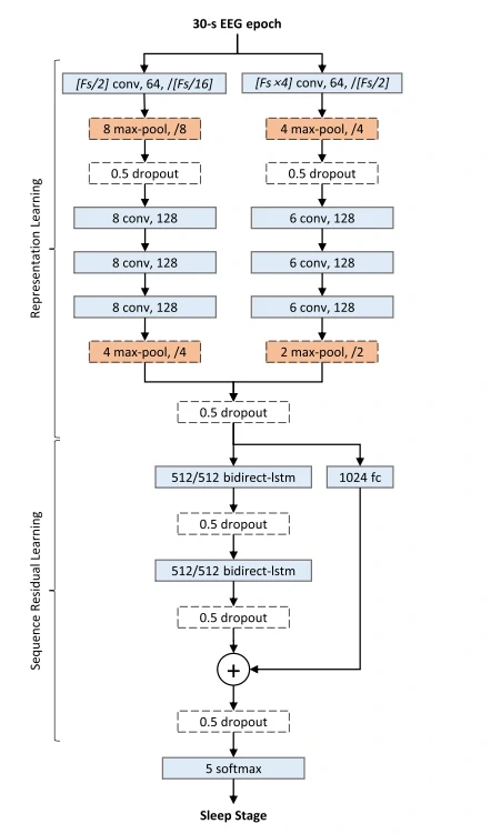 最近,在自动睡眠分期领域,由于深度学习网络不需要明确的特征提取,特别适合大数据方法,因此涌现出许多采用深度学习网络的算法,它在大型多中心睡眠数据集上提供了具有竞争力的分期性能。