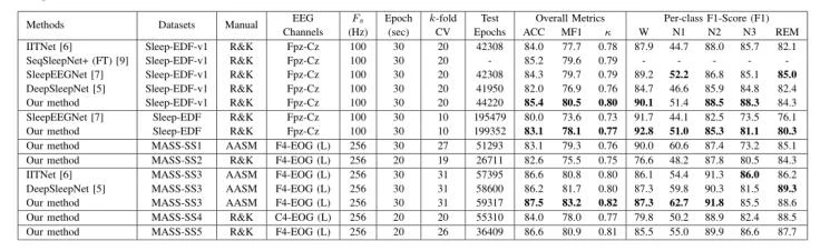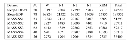 作者使用从蒙特利尔睡眠研究档案(MASS)和Sleep-EDF获得的七个公共睡眠数据集来评估模型。这些数据集是在不同的环境中收集的,并用不同的睡眠手册进行注释,可以用来证明模型的可推广性。在MASS中有5个子集MASS-SS1、MASS-SS2 MASS-SS3、MASS-SS4、MASS-SS5,除了SS4使用F4-EOG(left)通道,其他4个子集使用C4-EOG(left)通道,因为F4-EOG在这4个子集中不可用。而在Sleep-EDF和其扩展的版本Sleep-EDF-v1中使用FPz-Cz脑电图通道。另外,要强调的一点是作者使用的是原始的信号,没对信号进行任何的预处理(比如滤波)。