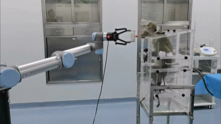 在此次试验中,团队在食蟹猴的颈静脉进行穿刺手术,将电极导入矢状窦,到达运动皮层脑区,识别猴的上肢运动意图。由于在肢体移动的情况下容易受到肌电信号干扰,试验人员将猴的肢体固定。当猴看到食物产生想吃的欲望时,脑机接口识别到兴奋的信号,通过信号控制机械臂将食物送到猴的嘴边。