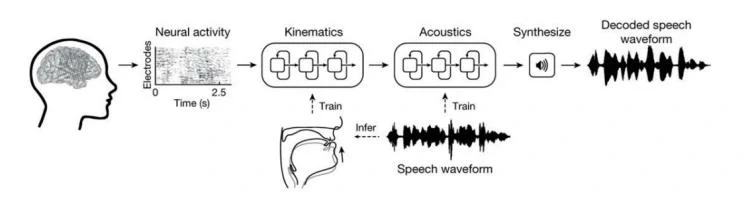 语音解码类脑机接口技术能够将神经活动直接转换为语音信号,对由于神经功能障碍而无法正常交流的群体具有革命性的意义。2019年4月, 加州大学旧金山分校的研究团队基于脑机接口技术设计了一种新型的神经解码器,该解码器能够通过提取大脑皮层活动对发声器官的运动情况来实现语音的合成。即使受试者不发出声音读句子,解码器也能实现语音合成。同年7月,该研究团队展示了基于高密度ECoG信号的模拟自然问答对话系统。利用在对话中记录下的脑信号,能够确定受试者何时在听、说,且能够预测所听、说的是什么,这一技术对于无法交流的患者具有重要意义。