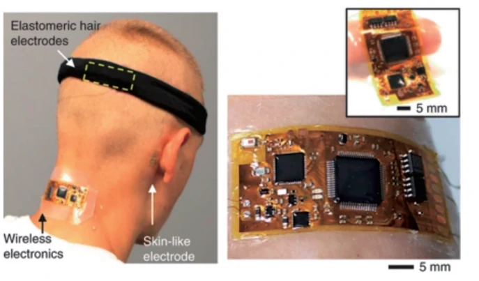 佐治亚理工学院及合作研究团队报道了一个完全便携式、无线、灵活的头皮电子系统,其中包括一组干电极和一个柔性膜电路。相比于商用系统,柔性电子产品因显著降低噪声和电磁干扰能够提高诱发电位检测性能。两通道的头皮电子系统获得了122.1 bit/min的信息传输率,允许对电动轮椅、电动汽车和无键盘演示进行无线、实时和通用的脑电控制。