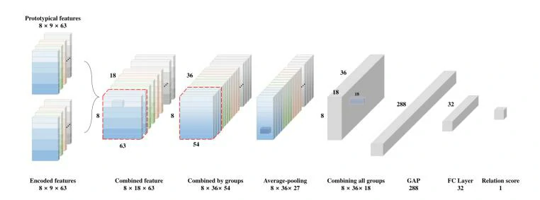 文章提出的方法是一种基于度量的小样本学习方法,之前主要应用在图像领域分类任务中。本团队成员叶耀光所介绍的原型网络[1]就是一个典型的基于度量的小样本学习方法,其思想是通过网络学习一个度量空间,然后计算待测样本与每个类的原型表示的距离,其中距离是通过线性距离计算公式比如欧式距离计算的。本文的度量模型是一种叫做关系网络[2]的模型,它是原型网络的改进,改进点就是在计算距离的时候,不再使用欧式距离计算,而是让网络自动学习计算距离的方式。