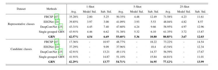 作者比较了1、5、25shot 设置下不同模型的实验结果,所提出的GRN方法在不同shot设置下都优于深度学习和FBCSP,且参数量比深度学习模型少。如表1。