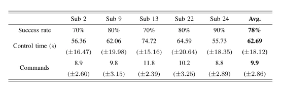 作者还进行了系统在线机械臂控制的实验,通过让受试者执行十个运动想象饮水任务,得出用户控制机械臂的成功率。五名受试者的平均成功率为78.00%。表2。