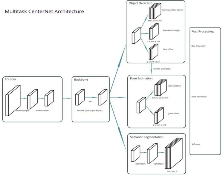 多任务学习能大大节省时间,降低内存占用,提高运行效率,但是感知相关的多任务学习网络更适用于相互之间有密切关系的多任务对象,面对各种相互关系不够紧密的学习目标,作者用一个增强了anchor-free 的CenterNet方法同时训练多个不同类型的任务,如目标检测、语义分割及人体姿态估计等。如下图所示:
