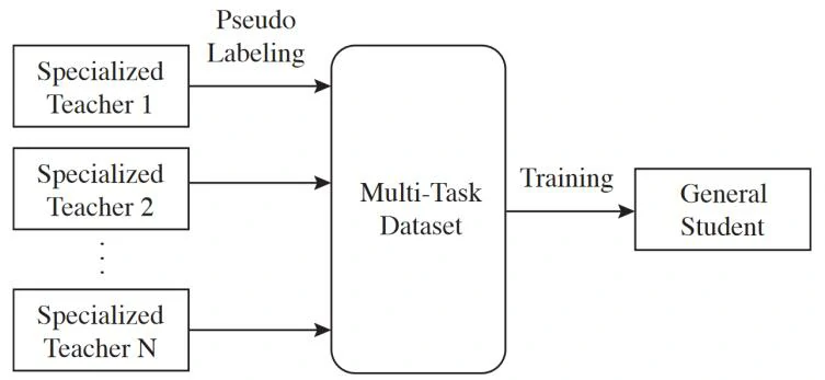 - 专业教师模型被用来标记一个更大的未标记数据集,以创建一个多任务伪标签数据集。例如,这些教师可以在Object 365检测数据集中生成图像分类和深度估计的伪标签。
