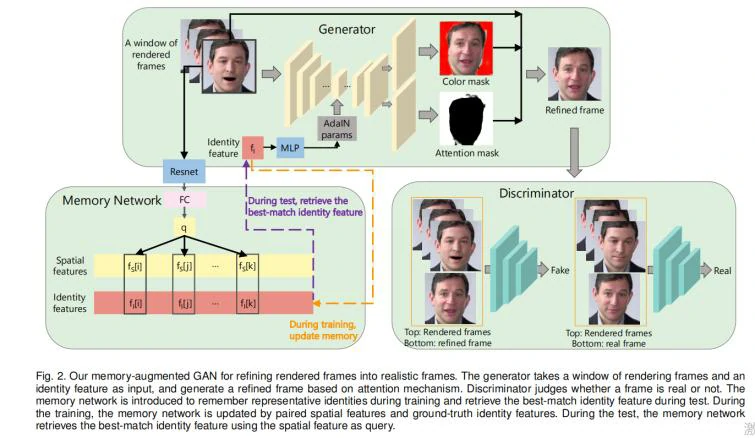 为了获取真实的帧,因此该研究提出了一种GAN方法,具体模型框架如上图。通过处理任意目标的渲染,减少需要用的帧数量。从而构建具备头部姿态的三维人脸。