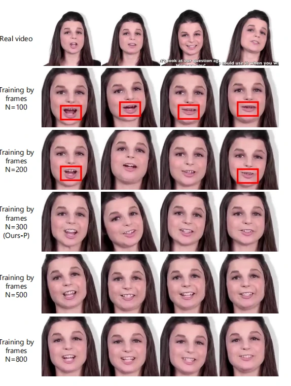 该研究由输入的短视频得到如下图所示的结果,分别为100帧、200帧、300帧、500帧和800帧的模型生成的结果。该研究找了一些用户观看,让用户挑选最满意的结果来找出最佳结果,其中63.6%的用户选择了800帧的结果,而100帧却没有用户选择,并且用户满意度与帧数成正比例增长。