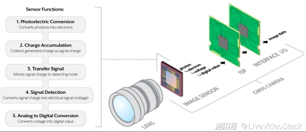 如上图所示,在相机系统中,外部世界的光信息(光子,photon)通过透镜或其他光学器件聚焦之后达到相机的图像传感器(CCD 或者 CMOS)。[1]