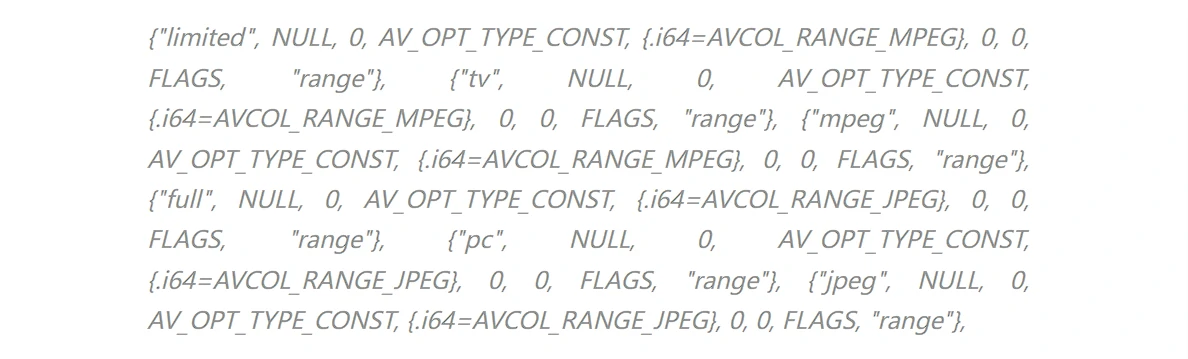 除了如上的参数外,AVFrame->range[23] 还用来存储视频中对应像素的每个分量的取值范围。在 vf_setparams.c[24]中也作了相关的定义说明: