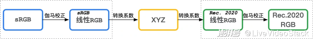 对于显示设备而言,sRGB->RGB(Rec.2020)的转换过程如下所示: