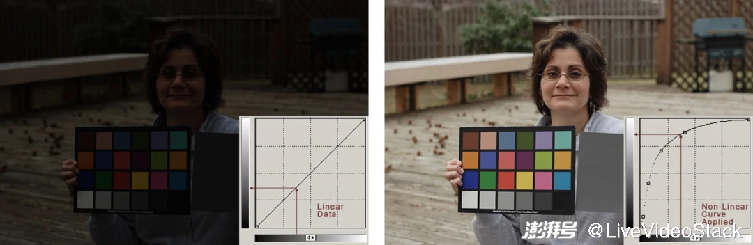 实际上,研究表明,人类视觉系统是以对数函数的方式来感知光亮度。这意味着,人眼会提高暗部的敏感度,降低高光部分的敏感度。[6]