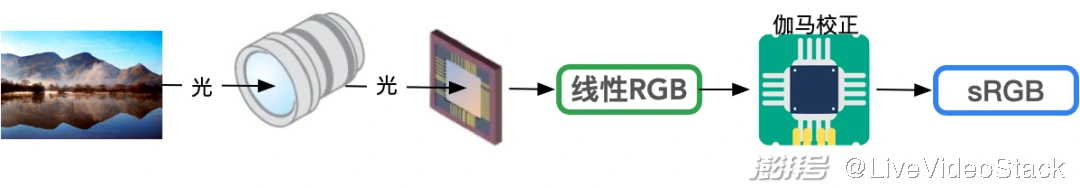 因此,在从线性 RGB 空间转换到非线性 RGB 空间时,需要γ作为转换参数。相机中的 ISP 模块负责对图像传感器的线性 RGB 进行伽马校正进而产生对应的符合人眼感知的非线性 RGB 数据。