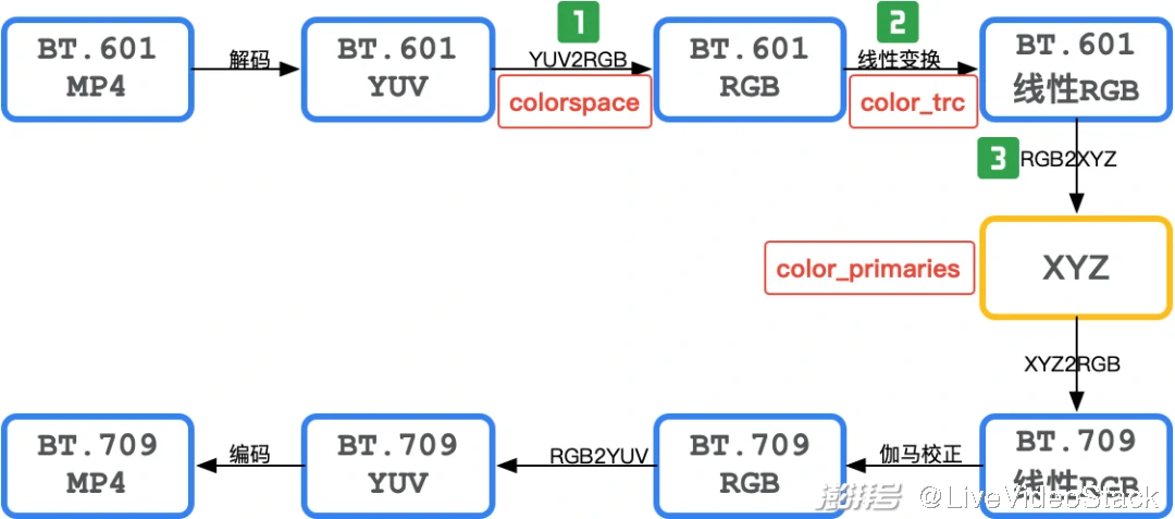 在视频转码阶段,如果我们希望对原视频进行色域的变换,例如从 BT. 601 转码为 BT. 709,则需要在不同色域的 RGB 数值之间进行转换。[13]