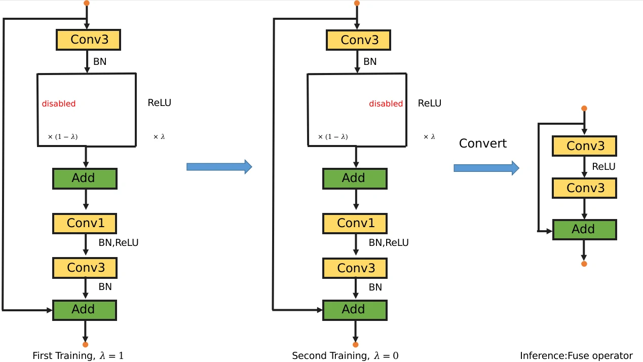 第二次训练红色的两个BN和Conv3继承自第一次训练的结果,参数冻结,仍然复用分类层。第二次训练新的小网络只需要更新第一层的conv3就可以了。比起图1,训练的时候不需要更大的网络,也不需要融合两个线性卷积算子(直接new一个)。因为直接引入一个卷积层比融合算子更简单,而且直接用小网络,大幅度降低了训练成本。但是最终小网络和大网络仍然是非常类似的,可以共享一个模型文件。
