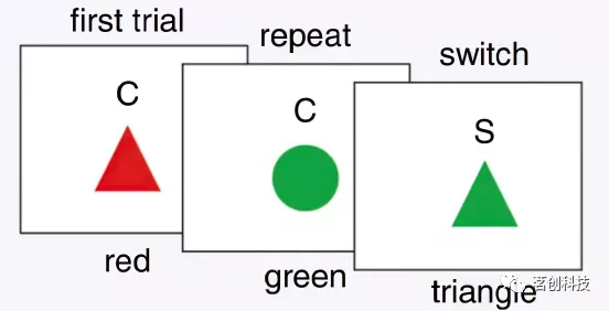 要求被试根据提示对刺激进行分类按键反应,对刺激的颜色和形状进行判断。左键表示圆形或绿色,右键表示红色或三角形。当被试看到当前的字母与前一个试次相同时,则同样对当前刺激进行颜色判断,否则,对当前刺激进行形状判断,依此切换。
