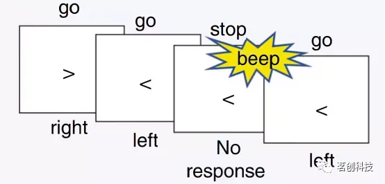 要求被试看到屏幕上出现刺激 (如“>”或“<”)时,就分别按右键和左键。如果听到作为停止信号的声音“哔”,就停止按任何一个键。
