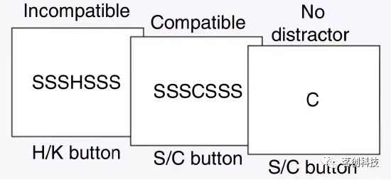 当中心靶刺激与两侧分心刺激同时出现时,两侧分心刺激带来的无关信息会对被试判断中心靶刺激造成干扰。不一致条件下,让被试按“K”键;一致条件下,让被试按“C”键;无分心刺激条件下,让被试按“C”键。