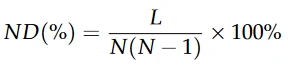 矩阵中的每个元素表示由相干性等测度确定的电极间连接的权重。可以使用不同的图参数来代替相干性,如网络密度、节点度、节点强度等。网络密度是指图中边的数量与可能存在的边总数的比值。网络密度可以通过使用以下方程来计算,其中L是链接的数量,N是节点的总数。