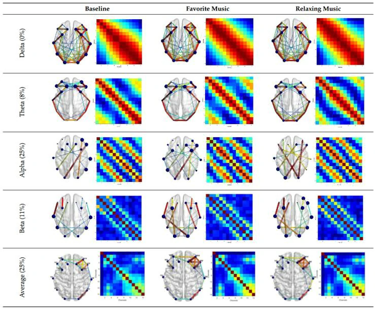 此项研究的目的是评估音乐对人脑功能连接的短时间和长时间影响。短时间的研究发现即使是短时距的聆听音乐也能显著改变大脑上的FC。无论是聆听喜爱的音乐还是放松的音乐,都有助于诱发放松;但在聆听放松音乐的情况下,效果更为显著。另一方面,对音乐长时间脑功能连接、网络密度和脑连接数量的研究发现,聆听轻松的音乐可以提高受试者额叶的功能连接性和连接强度。