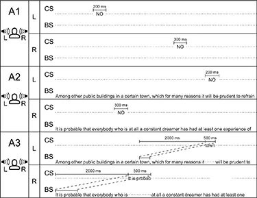 A2:CS与A1相同,为单词’no’,但有不同的有声读物片段作为BS。在CS出现时不会打断BS,所以被试在实验中可以在同一个音频流中同时听到’no’和有声读物。该组中被试可以选择重复单词’no’或默数出现次数作为心理任务。重复单词是为了能够跟快地跟上BS,而默数可以减少脑力的负担,所以被试可以选择他们认为舒服的一种。