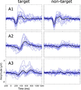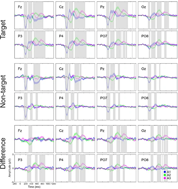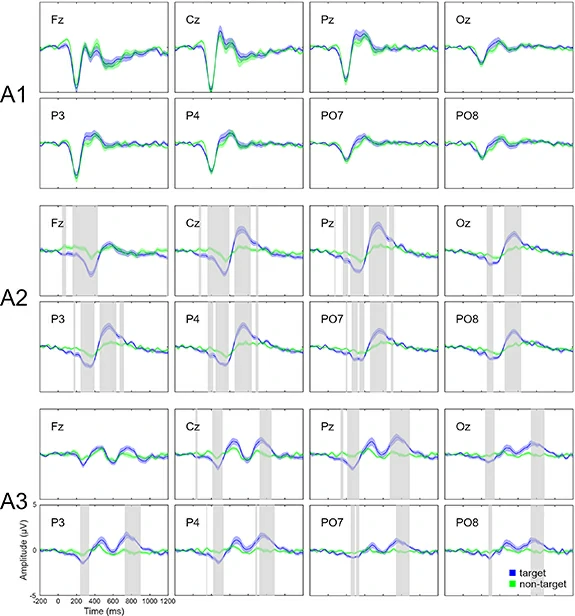 图9中,三种条件下都出现了较为明显的ERP,在A2和A3条件下,目标和非目标刺激的波形之间都出现了显著差异(灰色部分)。同时,A2和A3条件下的ERP出现了一定的延迟。