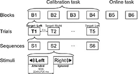 在校准任务中的每次试验开始时,都会通过听觉提示’左’或’右’,以及视觉提示指向左或右的箭头来告知被试者需要关注的音频流。