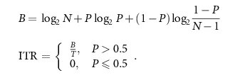 其中,B为每次选择的包含的信息数,P是系统的准确率,N是试验中的选择个数(N=2),T是完成试验所需的时间。