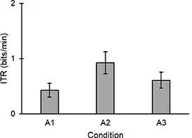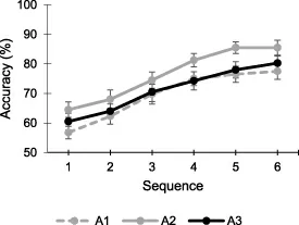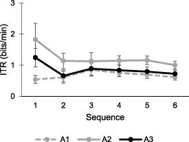 图4图5为三种条件下不同序列的准确率和ITR。将实验条件(A1、A2、A3)作为条件因子时,准确率和ITR都没有显著差异。