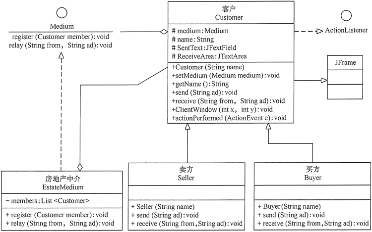 说明:韶关房地产交流平台是“房地产中介公司”提供给“卖方客户”与“买方客户”进行信息交流的平台,比较适合用中介者模式来实现。