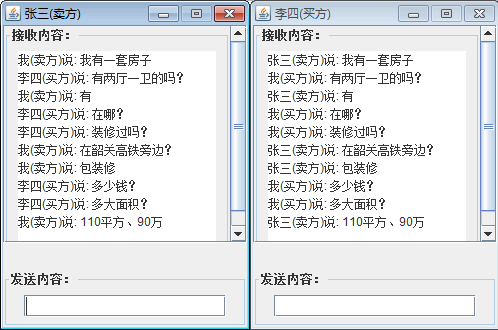 class Buyer extends Customer { private static final long serialVersionUID = -474879276076308825L; public Buyer(String name) { super(name); ClientWindow(350, 100); } public void send(String ad) { ReceiveArea.append("我(买方)说: " + ad + "\n"); ReceiveArea.setCaretPosition(ReceiveArea.getText().length()); medium.relay(name, ad); } public void receive(String from, String ad) { ReceiveArea.append(from + "说: " + ad + "\n"); ReceiveArea.setCaretPosition(ReceiveArea.getText().length()); } }