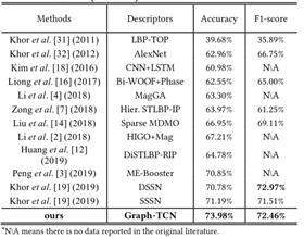 在评估文献提出的Graph-TCN方法效果的实验上,作者使用到CASME II和SAMM两个数据集,使用了最常用的跨数据集评估方法——leave-one-subject-out (LOSO)协议,同时采用的评估指标有两个,一个是分类的准确率(Accuracy),另一个是F1-Score(该评估指标本质上是对分类的精确率与召回率进行平均的一个结果)。