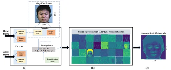 - 首先,编码器会提取起始帧和峰值帧的形状表征和纹理表征,控制器通过计算两张图像在形状表征上的变化,乘上放大因子(Amplification factor)来达到对形状表征进行放大的目的,解码器则是要将起始帧的纹理表征和放大后的形状表征进行解码生成完整放大后的图像。