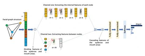 文章考虑到眉毛和嘴部两个区域是相对独立的两个肌肉群,因此面部图结构也被分为两部分,每个部分都会使用一个双通道的TCN网络来训练各自的图结构特征,如图6所示。