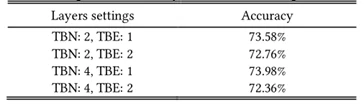 表1展示了Graph-TCN网络其它参数的设置情况,在3.3节我们介绍到Graph-TCN网络包含了TBN和TBE两种TCN残差块,而这两种残差块层数的设置会影响到网络的效果,因此表2展示了网络在两种残差块不同设置情况下的对比实验,并选择准确率最佳的设置——TBN层数为4,TBE层数为1的情况下来与其它方法做对比。